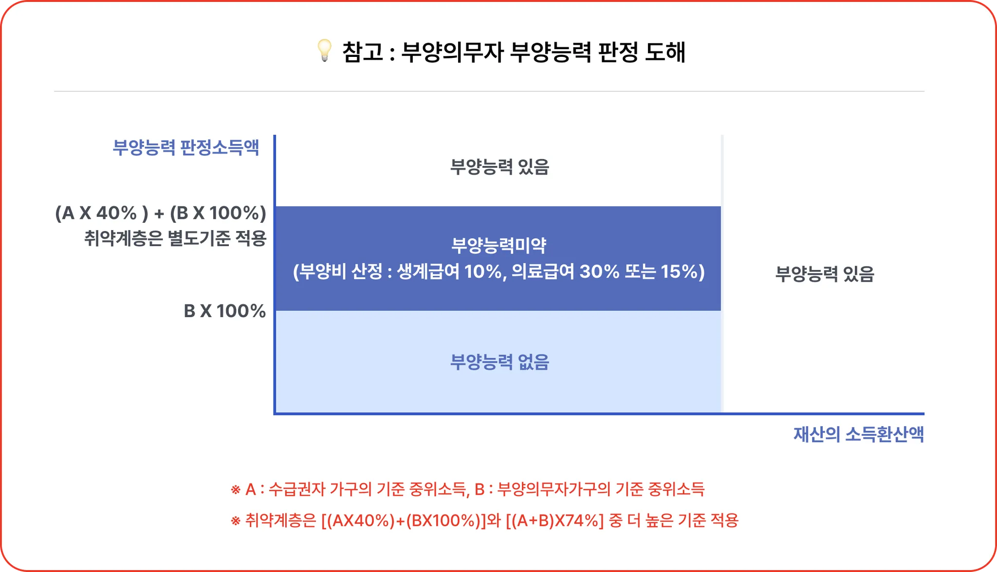 부양능력 있음: 부양의무자의 부양능력 판정소득액이 A의 40%와 B의 100%를 합한 금액 이상이거나, 재산의 소득환산액이 A와 B의 합의 18% 이상인 경우