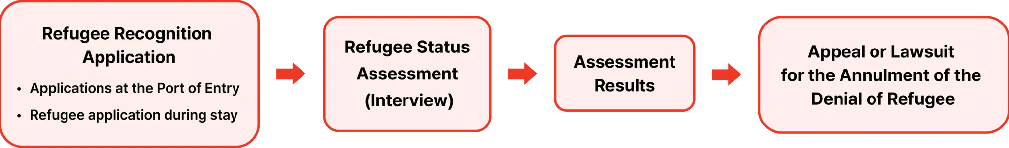 The refugee application process is broadly divided into two procedures: 'Refugee Application at Ports of Entry' and ‘Refugee application during stay.’ Until a final decision on refugee status is determined (or until the administrative appeal or administrative lawsuit against the denial decision is concluded, if such procedures are underway), the refugee applicant can stay in South Korea.