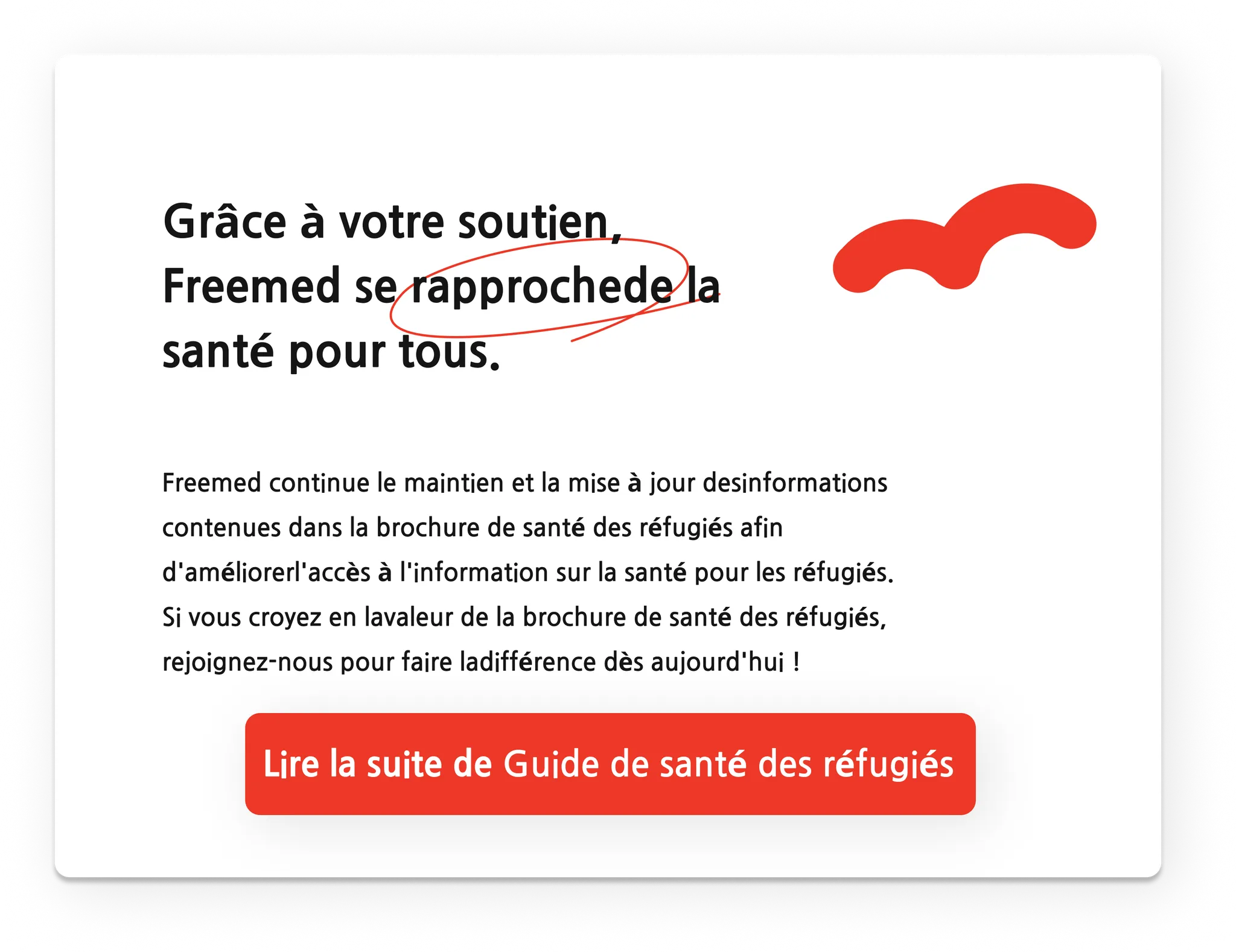 Freemed, qui envisage la santé pour tous sans discrimination (Health for All), a créé une brochure en ligne sur la santé des réfugiés pour répondre à ces questions. Elle vise à améliorer l'accès à l'information sur la santé en rassemblant des informations fragmentées et en les rendant disponibles dans plusieurs langues.